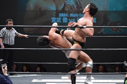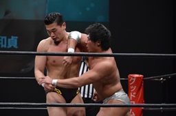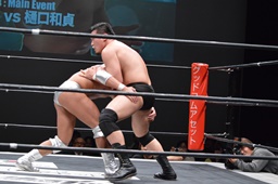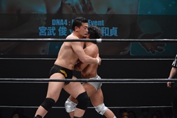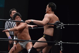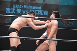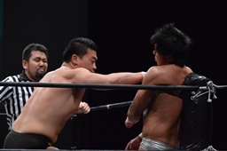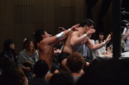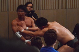 宮武ヘッドロック、樋口ロープに振ってショルダーブロックの打ち合い(左写真)、