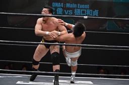 宮武チョップ連打から肩に担ごうとするが樋口ブロック(左写真)。