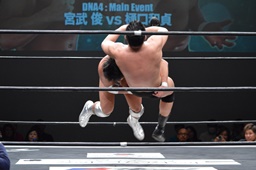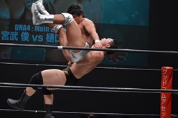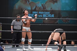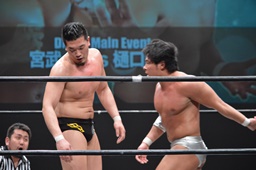 樋口ロープに振る、宮武はフライングバックエルボー(左写真)。