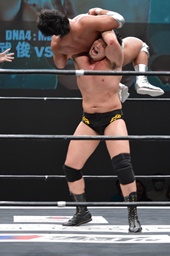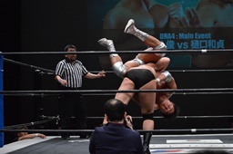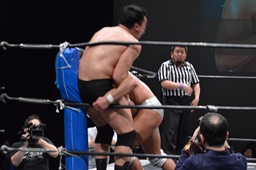 樋口ボディスラム、ロープに飛んでボディプレス(右写真)、カウント2。