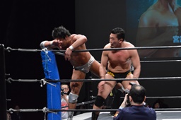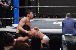 ドロップキック(右写真)、宮武は場外エスケープ。