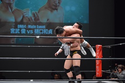 宮武ロープに飛ぶ、樋口キャッチすると肩に担いでコーナーにぶつけ(左写真)、