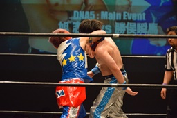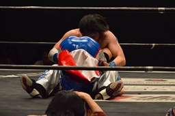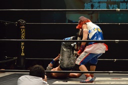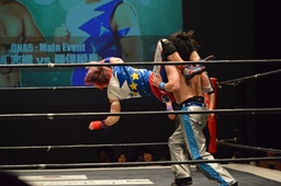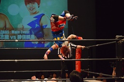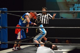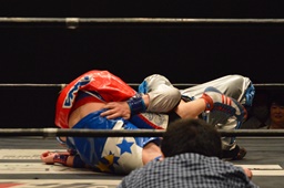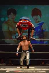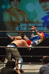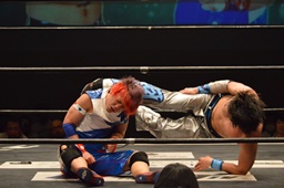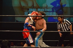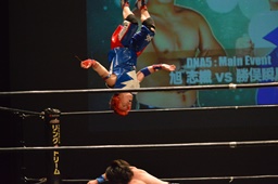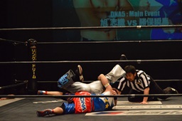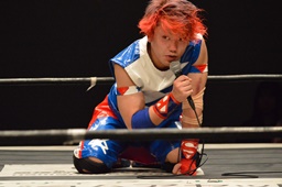 勝俣「負けてしまったんですけど、ちょっとマイクを持たせてください。今日はご来場、誠にありがとうございました。今回、1ヶ月前に樋口選手との試合が決まって、僕は樋口戦のために対策を練ったり、いろいろしてきました。だけど樋口選手は欠場になって、カードが変わって、旭選手と闘うことになりました。さっき旭選手も言ったけど、これも含めてプロレスなんだなと実感しました。そして僕は旭選手と闘えて本当に良かったと思います。今回の試合で僕はまだまだな部分が自分の中でいっぱい出てきました。ですが、これからももっともっと練習して、もっともっと強くなって、このDNAのテッペンに立ちたいと思います!これからも勝俣瞬馬、そしてDNA、みんなで頑張っていきますので、これからも応援よろしくお願いします!ありがとうございました!」(左写真)