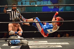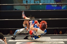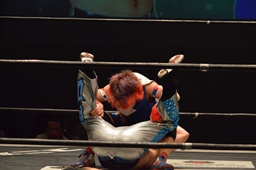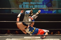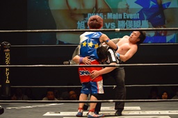 旭切り返してエビ固め(左写真)、カウント2。