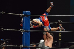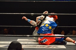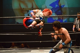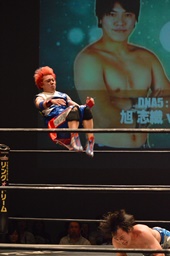勝俣旭をリングに戻すとコーナーに振って串刺しドロップキック(右写真)、