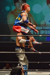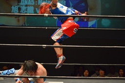 ムーンサルトプレス、旭かわす(左写真)、勝俣着地。