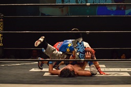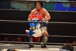ムーンサルトプレス(右写真)、カウント2。