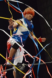 紙テープを体に巻きつけてサマーソルト(左写真)。美しい。