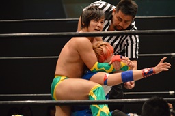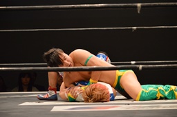 そして雪崩式フランケンシュタイナー(左写真)、カウント2。