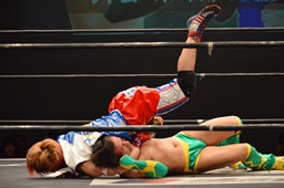 反動をつけてDDTに(左写真)、これでカウント3。