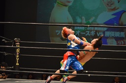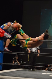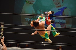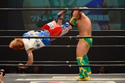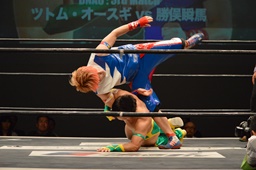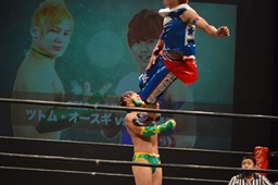 フランケンシュタイナー(左写真)、ドロップキックで場外に落とすが、飛ぼうとするとオースギ逃げる。
