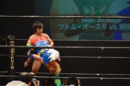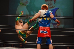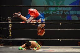 勝俣コーナーに上る、オースギはジャンピングハイキック(右写真)。