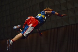 オースギ延髄蹴り、首を抱え込んで高く飛び上がり(右写真)、
