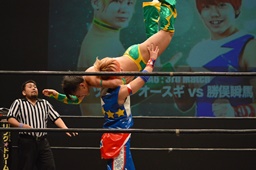 オースギ足を取る、勝俣キャッチ延髄、オースギかわす(右写真)。10分経過。