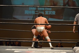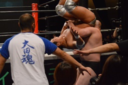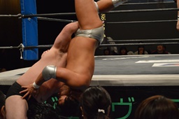 ロープに振る、岡林切り返してラリアット、宮武かわしてハートアタック(右写真)、カウント2。