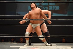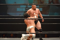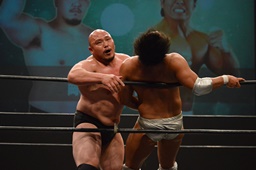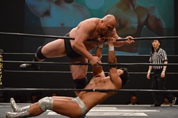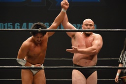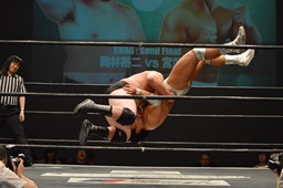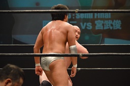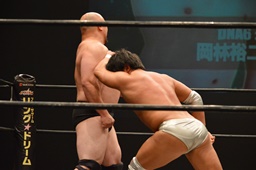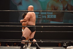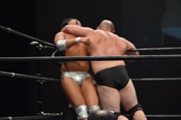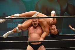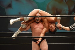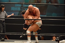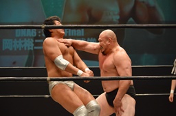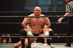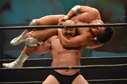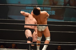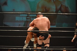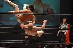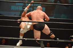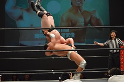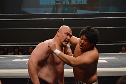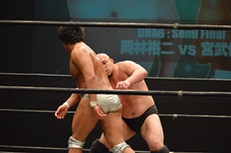 宮武ロープに飛ぶ、岡林キャッチしてアバランシュホールド(右写真)。