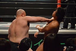 ロープにもたれた宮武に岡林が突っ込む、宮武トップロープを引き下げて岡林を場外に落とす(左写真)。