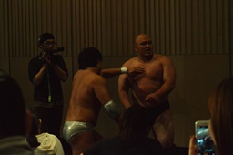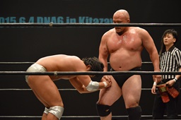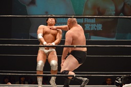 岡林場外でカナディアンバックブリーカー(右写真)、宮武着地。