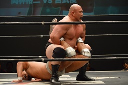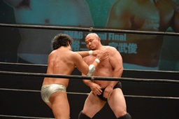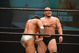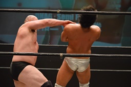 岡林ボディスラム、宮武はヒザ立ちでチョップ(右写真)。