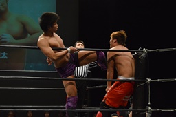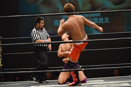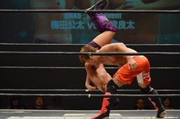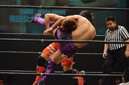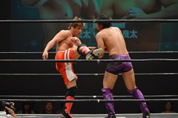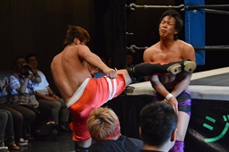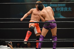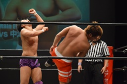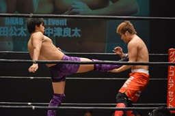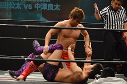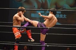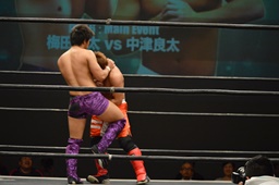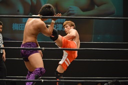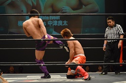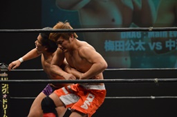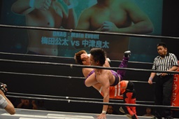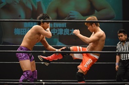 梅田ボディスラム、ヒザ立ちの中津にキック(右写真)。