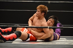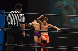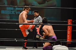 チキンウィングアームロック(右写真)、梅田ロープ。10分経過。
