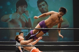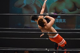 中津ロープに振る、梅田ロープに飛び乗って反転ハイキック(左写真)。