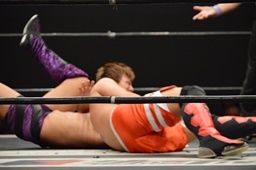 トップロープ越しに手を伸ばした梅田、中津はその手をつかんで飛び降り式のアームブリーカーに。場外に出るとしてやったりの表情(左写真)。