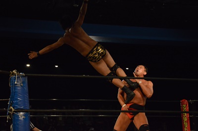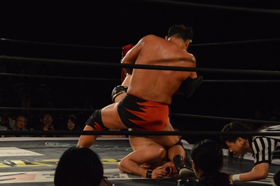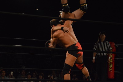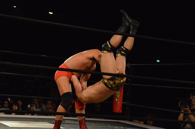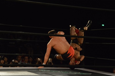 大谷ブレーンバスターの体勢、渡瀬ブロックして逆に投げる(右写真)。