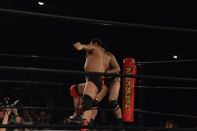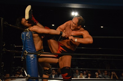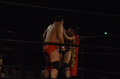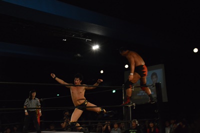 コーナーに上ってミサイルキック(右写真)、カウント2。