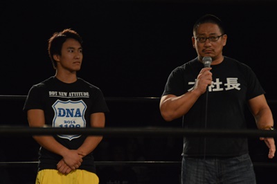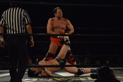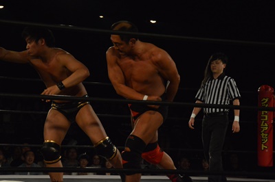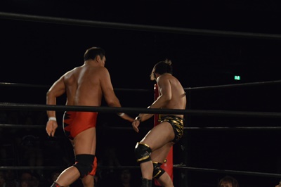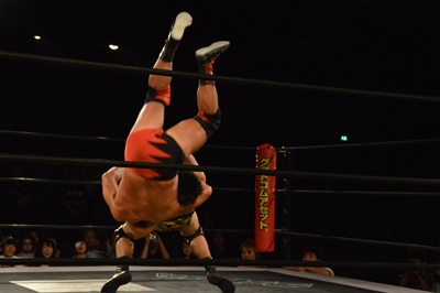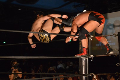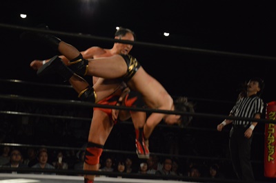 渡瀬ドロップキック(左写真)、大谷を落とす。