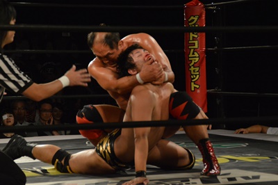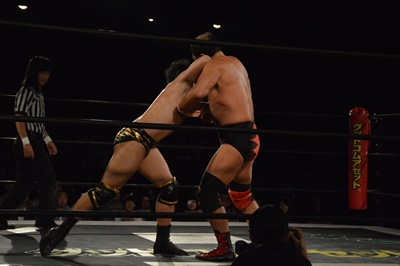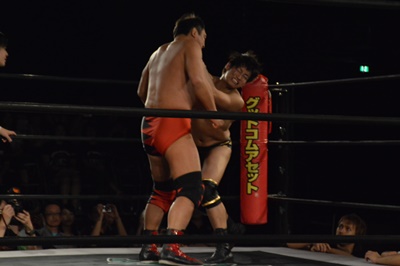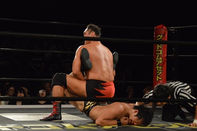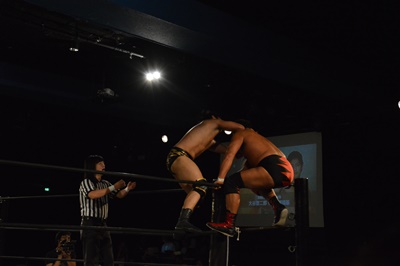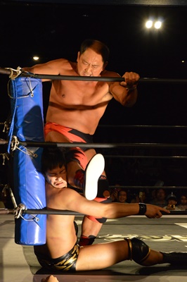 渡瀬が先制攻撃、エルボー連打でコーナーに詰める、首投げからニースタンプ。ボディスラム狙うが上がらず(右写真)。