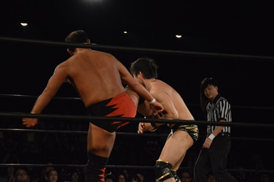 渡瀬エルボー連打、大谷ヘッドバット(左写真)、渡瀬ダウン。