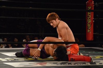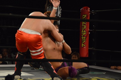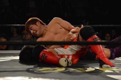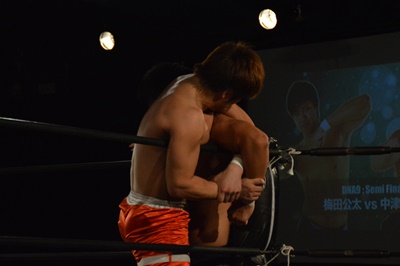バックの取り合いから中津がハンマーロック(右写真)、押さえ込んで両肩着ける、カウント2。
