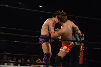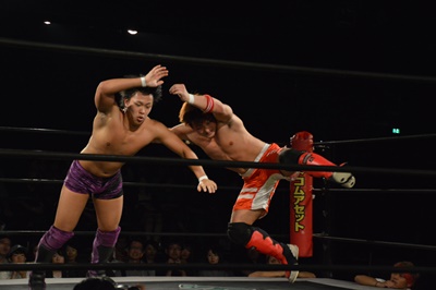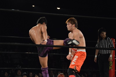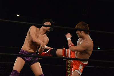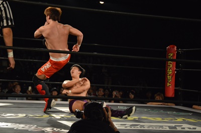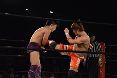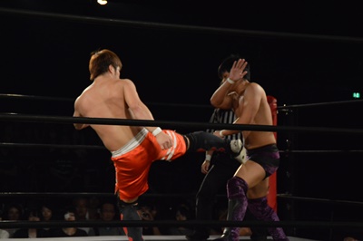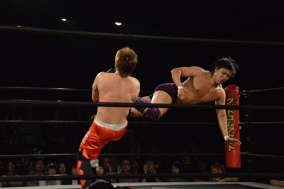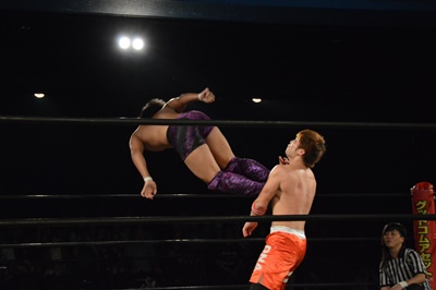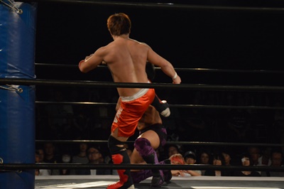コーナーに振って串刺しミドルキック、エプロンに出てスワンダイブミサイルキック(左写真)。