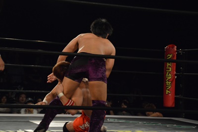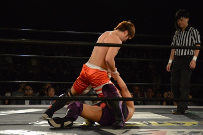 梅田ボディスラム狙う、中津背後に着地してフェースクラッシャー(右写真)、