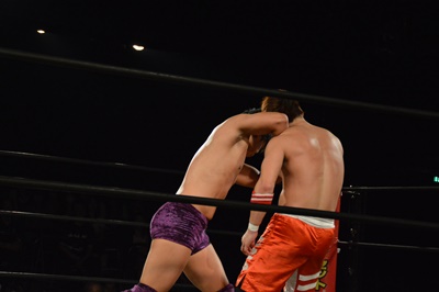 中津リングに戻る、梅田エルボー連打(右写真)、