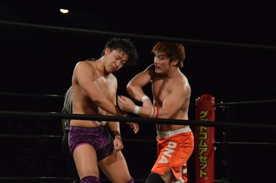 中津は梅田の腕をロープに絡めて攻める(左写真)。エプロンに出て飛び降り式のアームブリーカー。