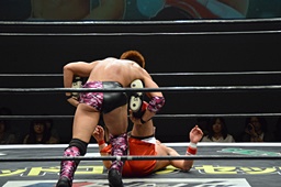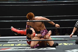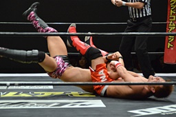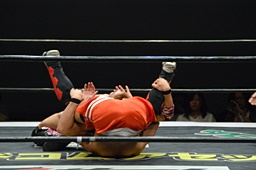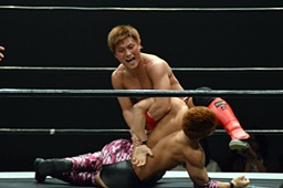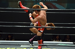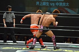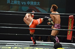 麻生ブロックしてエルボー(右写真)、中津を落とす。