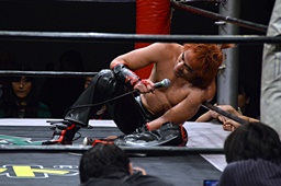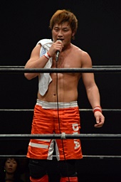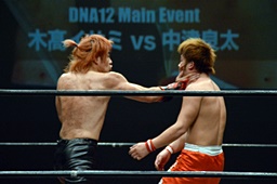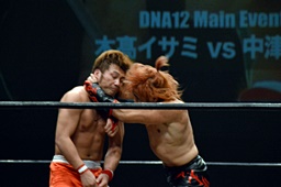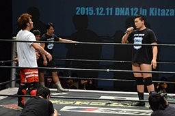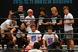 中津「今の試合が僕のDNA所属最後でした。BASARAに無事に行けることが決まりましたので、またBASARAにも足をお運びください。別にプロレスを辞めるわけじゃないのですけど、とりあえずDNAでひとまずありがとうございました。いい意味で上下関係のないいいチームだと思います。ただ、デカいの!お前には負けっぱなしだから、勝ってやるからな。DNAはみんないい意味で仲がいいし、切磋琢磨してます。今後もDNAをよろしくお願いします。DNAの魂持って僕がBASARAの中心に行って面白くしますから、これからもDNAとBASARA、よろしくお願いします!」(左写真)