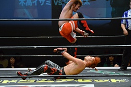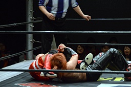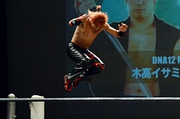 イサミコーナーに上ってダイビングダブルニードロップ(左写真)、