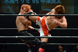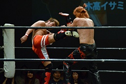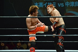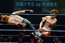 イサミ前蹴り、ロープに飛ぶ、中津カウンターでハイキック(右写真)、ダブルダウン。