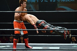 イサミ着地して垂直落下式ブレーンバスター(右写真)。