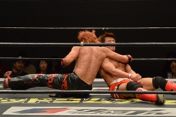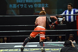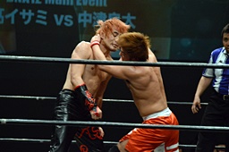 中津ハイキック、イサミかわしてロケット頭突き(左写真)。15分経過。