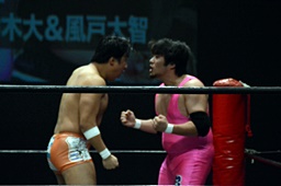 バックドロップで風戸を一回転(左写真)。10分経過。