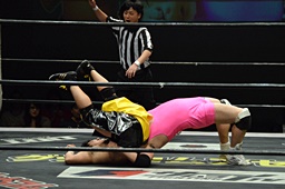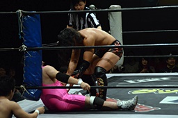 片逆エビ固めで絞る(右写真)、鈴木ギブアップ。