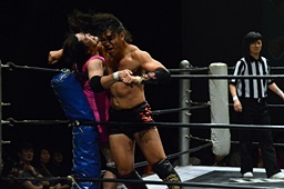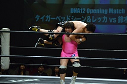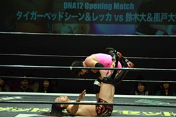 風戸ヘッドロックからフライングメイヤー(左写真)、レッカはヘッドシザーズでブレーク。両軍タッチ。