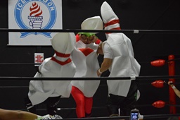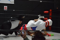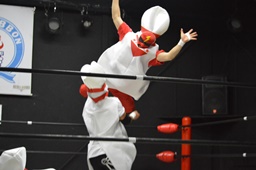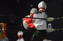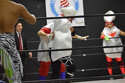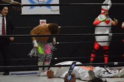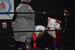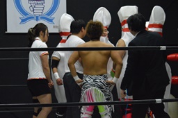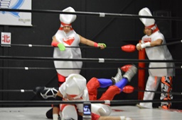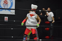 レフェリーは竜剛馬。ピンがピンを場外に(右写真)。
