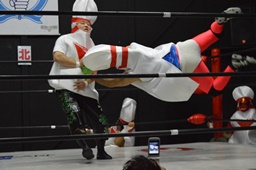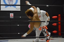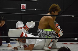 翔太が影山にブレーンバスター狙うが影山切り返す(左写真)。丸山にタッチ。翔太もウラノにタッチ。