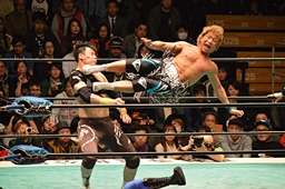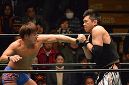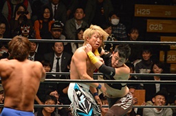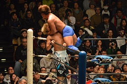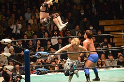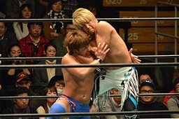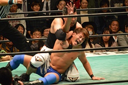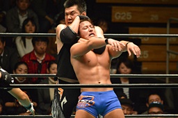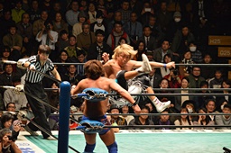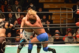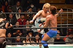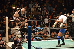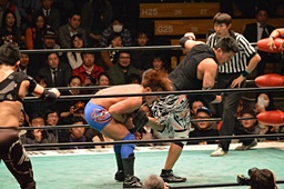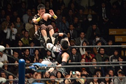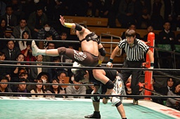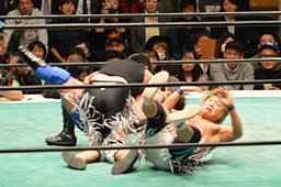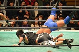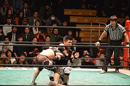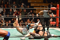 ブレーンバスター狙うが佐々木がブロック、逆に投げる(左写真)、郡司にタッチ。