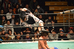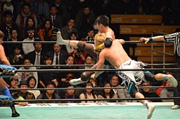 日高がネックブリーカードロップ、そこに藤田がコーナーからダイビングニードロップ(左写真)。藤田にタッチ。